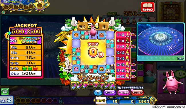 「アニマロッタ」シリーズは登場するキャラクター「アニマ」たちと一緒にルーレットで数字をそろえて遊ぶボール抽選ゲームです。 今回のアップデートでは、スゴロク風の「サンシャインワンダーチャンス」、いずれかのJPポケットに4回ボールが入るとJACKPOTが獲得となる「サンシャインJACKPOT CHANCE」など、新たなチャンスゲームが追加されました。