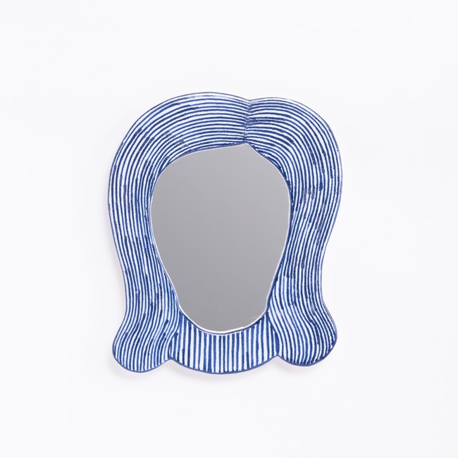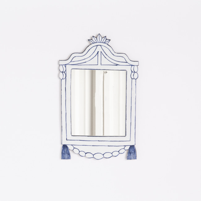 マリアンヌの実家にかなり古い時代の鏡があった。それは木製の鏡であったが、金色に塗装されていた。「これを塗った人は高級に見えるようにしたかったのね」と彼女は面白そうに笑い「フェイクの鏡」という。彼女はそれを作品にするときに、金色にしなかった。そのことで鏡を本来の姿に戻してやり「フェイクの鏡」とう汚名を数世紀ぶりに返上したのだ。(商品サイトより)