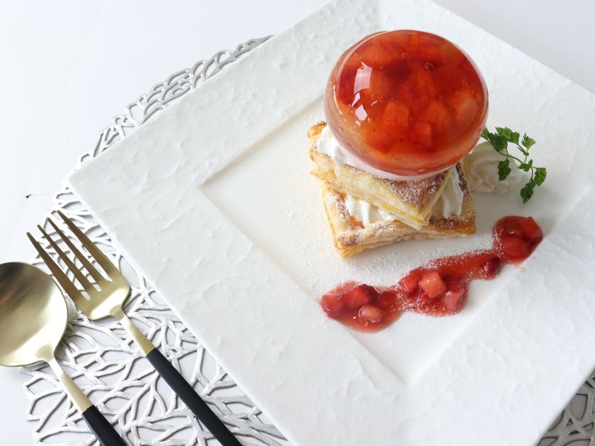 イチゴをとじ込めたゼリーとムースをあわせた写真映え抜群の「ストロベリーボールパイ」は1人1皿提供される贅沢スイーツ。