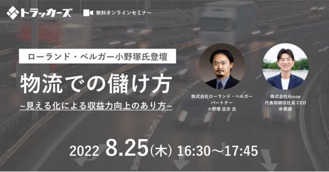 トラック保有企業のための業務効率化プラットフォーム「トラッカーズ」(https://market.trck.jp/)を運営する株式会社Azoop(アズープ、本社:東京都港区、代表取締役:朴 貴頌、以下:Azoop)は8月25日(木)に、ローランド・ベルガー 小野塚 氏をお迎えし「物流での儲け方~見える化による収益力向上のあり方~」を開催することをお知らせいたします。