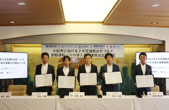 石川県小松市(市長:宮橋 勝栄)、BOLDLY株式会社(ボードリー、本社:東京都港区、代表取締役社長 兼 CEO:佐治 友基)、株式会社ティアフォー(本社:愛知県名古屋市、代表取締役社長:武田 一哉)、アイサンテクノロジー株式会社(本社:愛知県名古屋市、代表取締役社長:加藤 淳)及び損害保険ジャパン株式会社(本社:東京都新宿区、代表取締役社長:白川 儀一)の5者は、令和6年に予定される北陸新幹線小松駅開業に合わせ、JR小松駅・小松空港間のさらなるアクセス向上を図るため、自動運転バスの定常運行の社会実装を軸とした連携協定を、令和4年8月3日に締結しました。