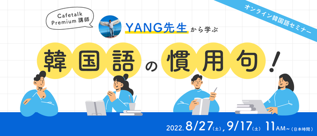 世界中の講師と生徒をつなぐオンライン習い事サイト「カフェトーク(http://cafetalk.com/)」を運営する株式会社スモールブリッジ(本社:東京都渋谷区、代表取締役:橋爪小太郎)は、2022年8/27(土)11時~、9/17(土)11時~の両日、カフェトークでPremium講師として活躍するYANG講師によるオンライン韓国語セミナー「韓国語の慣用句」を開催いたします。