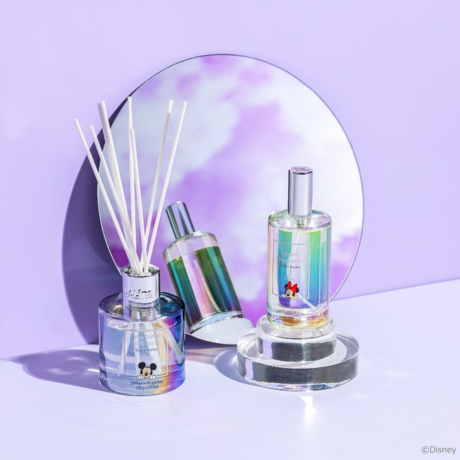 バイオレットやジャスミンの華やかな香りと、アンバーの深みのある甘さが重なるフレグランスディフューザー。シンプルながらも虹色に輝く容器と、ミッキーが顔をのぞかせるデザインで、お部屋を楽しく彩ります。