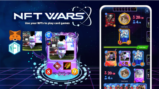 『NFTWars』は、手軽にNFTプロジェクトにゲームのユーティリティを付与できるサービスです。ユーザーはウォレットで所有するNFTを使用し、様々なNFTプロジェクトのカードゲームで遊ぶ世界の実現を目指します。