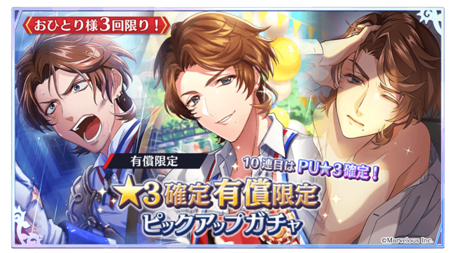 夏休みスペシャルキャンペーン第八弾として、過去に登場した期間限定のカードも含む、★3確定有償限定ピックアップガチャを開催いたします!今回のガチャでは「グラース(CV:寺島拓篤)」をピックアップ!期間限定、おひとり様3回限りの限定ガチャで、10連目では必ずシャスポーの★3カードのいずれかが排出されます。期間限定カードの★3「【アプリコットの王子様】グラース」が手に入るかもしれないこの機会をどうぞお見逃しなく!