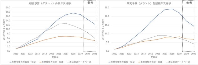 図:「生物資源の保護を拡充する社会の実現」の解決策に関わる研究予算(グラント)件数および配賦額の年次推移。アスタミューゼの無形資産可視化データベースから作成。2010年を1とした比で示した。配賦額はプロジェクト期間で均等割りした値を集計。2020年以降はデータベースに未登録のものが存在するため参考値。