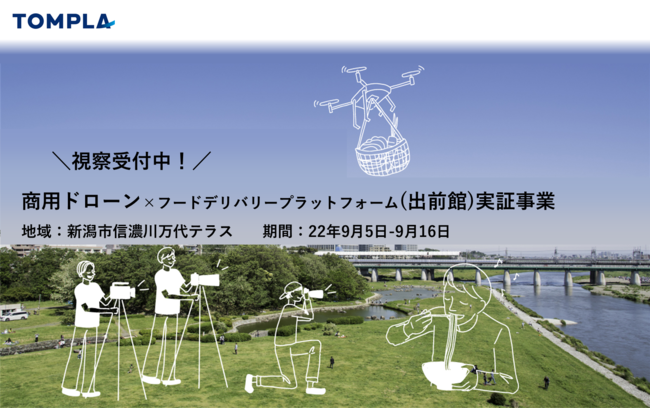 TOMPLA株式会社(本社:新潟県新潟市天神1-1、代表取締役:藤本高史)は、2022年9月5日から16日まで、新潟市信濃川万代テラスエリアで、フードデリバリープラットフォーム、出前館を利用したフードデリバリーの試験導入を行います。