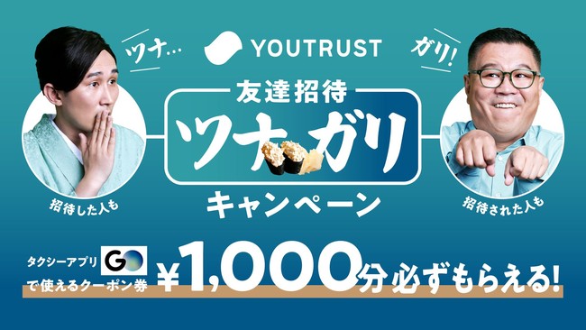 タクシーCMの放映開始を記念して、キャリアSNS「YOUTRUST」サービス内でユーザー毎に発行される招待URLをご友人に送り、招待されたご友人がYOUTRUSTに新規登録すると、招待した人・された人双方に1招待あたり1,000円分のタクシーアプリ「GO」で使えるクーポンを特典として差し上げます。