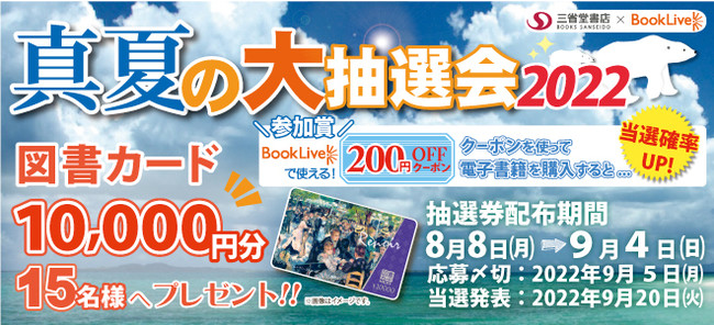 凸版印刷株式会社のグループ会社である、株式会社BookLive(本社:東京都港区・代表取締役社長:淡野 正)が運営する総合電子書籍ストア「ブックライブ」は、業務提携している三省堂書店と合同で「真夏の大抽選会2022」を2022年8月8日(月)から9月4日(日)の期間、全国の三省堂書店で実施します。