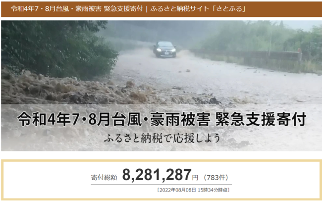 ふるさと納税ポータルサイト「さとふる」(https://www.satofull.jp/)を運営する株式会社さとふる(本社:東京都中央区、代表取締役社長:藤井 宏明)は、2022年7月8日に開設した「令和4年7・8月台風・豪雨被害 緊急支援寄付サイト」(https://www.satofull.jp/static/oenkifu/202207_typhoon.php)にて、8月8日より、山形県河北町、滋賀県長浜市の寄付受け付けを開始します。これにより本サイトで扱う自治体数は29自治体となりました。7月以降に発生した台風・豪雨被害への寄付総額は8月8日午後3時半時点で、本サイトを通して800万円以上(約800件)となりました。各自治体に集まっている寄付総額などの最新情報は、「令和4年7・8月台風・豪雨被害 緊急支援寄付サイト」に記載しています。