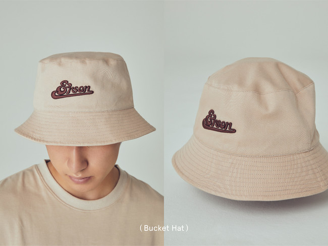 ベージュ生地に筆記体の&RSONロゴをあしらったレトロデザインのバケットハット。