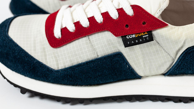 アッパーの材料にコーデュラナイロンを使用。その中でも米国Honeywell社の特殊繊維スペクトラを配置した高機能生地を採用している。この材料は耐切創性(たいせつそうせい)の高い素材で、通常靴を作る際の抜型の刃物すら跳ね返す強度を保つ。そのハイスペックなナイロンを本体材に、ビンテージスニーカーに見られるシワ感の表現や、シュータンのディティールなど随所にこだわりを見せた仕上がりになっている。