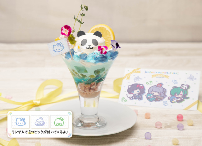 青いゼリーとパンダアイス、グミベアをトッピングした、かわいさ満点のレモンパフェ。アイドルユニット&サンリオキャラらしい、かわいさ満点のパフェ。