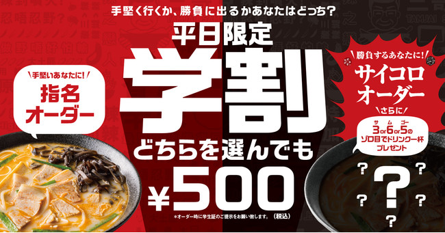平日限定で、オーダー時に学生証のご提示いただいたお客様を対象に、米線を一杯500円(具材1品)でお楽しみいただける“学割”キャンペーンをタムジャイサムゴー全店にて実施いたします。