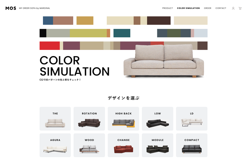 「MOS」は、10のデザイン、80の色と柄、好みのサイズで自由にカスタマイズできる、オンラインオーダーソファです。1968年創業の家具店が展開するMARGINALが現代の多様化するライフスタイルを捉え、個人の好みに合ったソファ選びの形を10万円台からのカジュアル価格で実現いたしました。