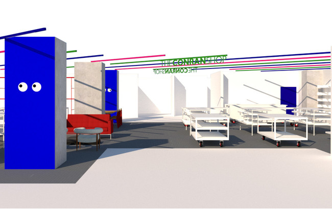 スチールやコンクリートといったインダストリアルな素材を使用し、白を基調に、ブランドカラーであるコンランブルーをはじめとした鮮やかなカラーを散りばめたストアデザインは、商品の優れたデザイン性を引き立てるとともに、訪れたお客さまの目を楽しませてくれます。また床から天井まで、柱を覆うように設置されたスクリーンには、ザ・コンランショップのグラフィックチームが手がけるグラフィックコンテンツが流れます。