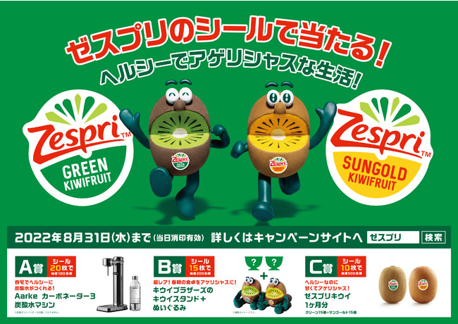 楽しみながらヘルシーな生活を続けてほしいと考えるゼスプリは、日々の生活をヘルシーでアゲリシャス*にするための賞品をご用意しました。応募の締切は、2022年8月31日(水)まで、当日消印有効です。詳しくはキャンペーンサイトをご覧ください。