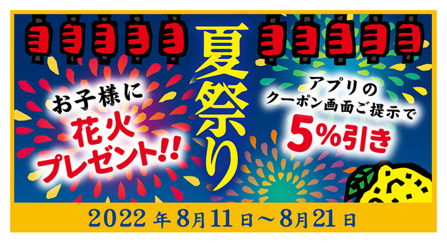 『ゆず庵』では、 期間中にご来店いただいた小学生以下のお子さま全員に、花火をプレゼントいたします。さらに「ゆず庵公式アプリ」のクーポン画面をご提示いただくと、お会計の税込総額から5%引きいたします。