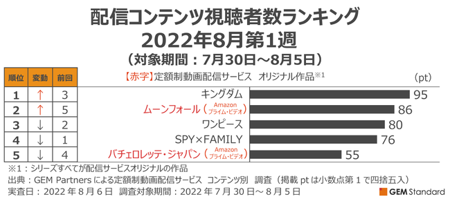 エンタテイメント業界に向けたデータ×デジタルマーケティングサービスを提供するGEM Partners株式会社(ジェムパートナーズ、所在地:東京都港区、代表取締役:梅津文)は8月12日(金)、複数の定額制動画配信サービスを横断して集計した2022年8月第1週の「配信サービス視聴者数ランキング(調査対象期間:7月30日~8月5日、調査対象:日本在住15~69歳男女)」を発表します。