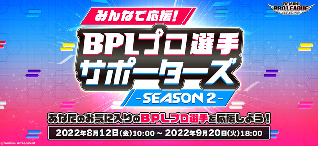 株式会社コナミアミューズメントは、本日8月12日(金)10:00 より、アミューズメント施設向け音楽ゲーム『beatmania IIDX 29 CastHour』(ビートマニア ツーディーエックス ニジュウキュウ キャストアワー)にて新たなイベント「みんなで応援!BPLプロ選手サポーターズ -SEASON 2-」を開始しました。