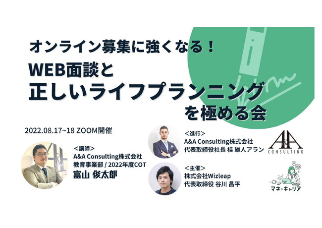 お金の相談プラットフォーム「マネーキャリア」を運営する株式会社Wizleap(東京都渋谷区、代表取締役 谷川昌平)は、2022年8月17日(水)、8月18日(木)にオンライン配信の業界最大級の金融セールス向けセミナー「オンライン募集に強くなる!WEB面談と正しいライフプランニングを極める会」を実施いたします。