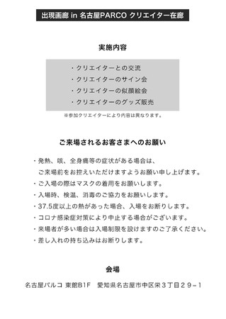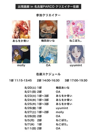 ■さらに、グッズ参加クリエイターのうち数名は、名古屋パルコの展示会場に在廊します。会場では、クリエイターとのコミュニケーションや、オリジナルグッズをご購入いただくことができます。