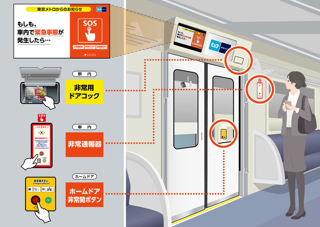 今回、国土交通省技術基準検討会による「車内非常用設備等の表示に関するガイドライン(2022年6月公表)」を踏まえ、より一層、当社線を安心してご利用いただくことを目的に、車内緊急時における非常用設備である非常通報器、非常用ドアコック、ホームドアの非常用設備の設置位置や使用方法について、よりわかりやすくお客様にご理解いただけるよう、8月15日(月)から東京メトロ線全9路線の車内ディスプレイ等で車内緊急時における非常用設備の位置、使用方法及び留意点等に関するご案内映像の放映を開始いたします。