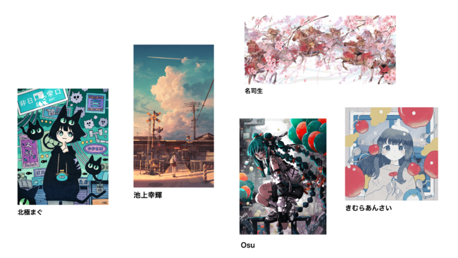きしんII世、Ryuse.、しんいし智歩、みうらドーナツ、ちかめ、五十嵐朱梨、Aotakana、雨乃けい、OH MANKEE、taniori、ゴトーヒナコ、AIHARA STUDIO、福井伸実、PONKO、てんてこ、いけもとしょう、カナイユウ、