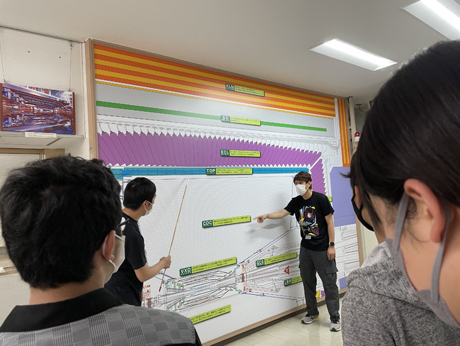普段はコンクリート壁で隠れているBelle II測定器の一部分が見られるなど貴重な展示もあり、参加者は思い思いに写真を撮りながら、真剣な様子で見学を楽しんでいました。また、参加者からは研究員の方々や須貝への質問が活発に飛び交い、須貝が熱心に回答したり説明を行ったりする場面もありました。見学は約3時間におよび、盛り上がりを見せました。