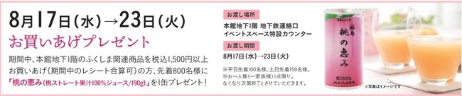 8月17日(水)から8月23日(火)まで松坂屋上野店本館地下1階 ほっぺタウン(鮮魚・精肉・青果・グローサリー・和洋酒売場)にて美味しいふくしま食品を販売いたします。各日先着で「桃の恵み(桃ジュース)1本」のお買い上げプレゼントもありますので、みなさまのご来館をお待ち申し上げます。