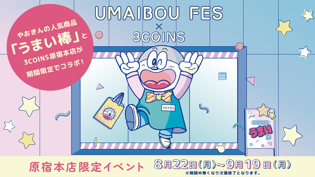 あなたの“ちょっと幸せ”をお手伝いする雑貨ブランド「3COINS」(スリーコインズ)では、「3COINS原宿本店」限定のポップアップイベント「UMAIBOU FES」を2022年8月22日(月)から9月19日(月)まで開催します。