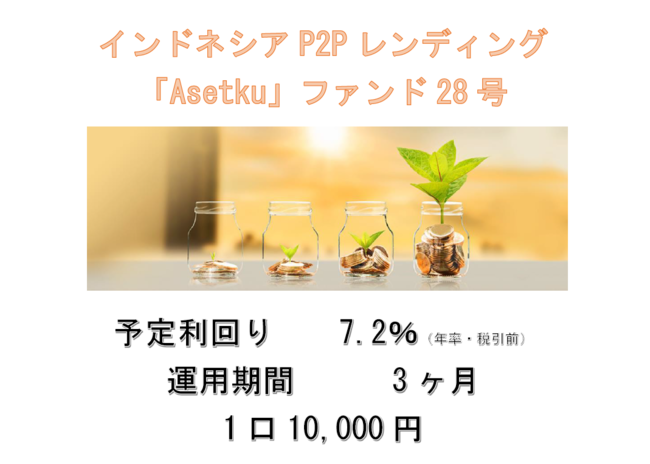 サン・キャピタル・マネジメント株式会社(大阪市中央区、代表取締役社長:前田利和)が運営するソーシャルレンディングサービス「アンシンバンク」は、本日15:00よりインドネシアP2Pレンディング「Asetku」ファンド28号の募集を開始いたします。募集要件は、運用期間3ヶ月・予定利回7.2%(年率・税引前)・募集金額2,000万円となります。