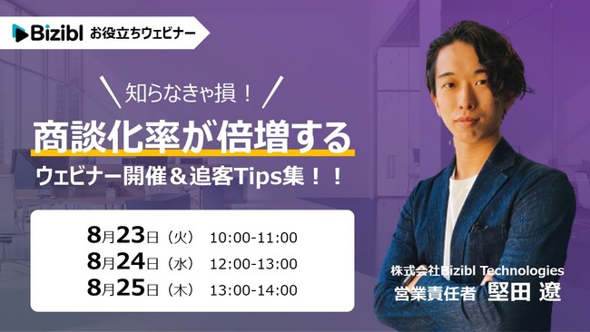 株式会社Bizibl Technologies(本社:大阪市北区、代表取締役:花谷燿平、以下当社)は、『【知らなきゃ損】商談化率が倍増するウェビナー開催&追客Tips集!!』と題したお役立ちウェビナーを、2022年8月23,24,25日に開催いたします(内容は全て同一です)。