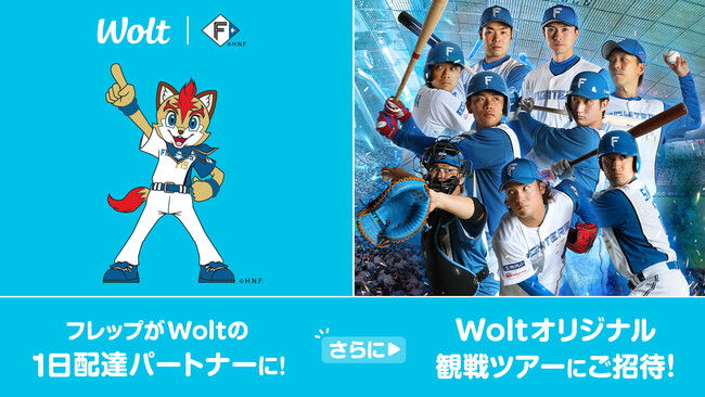 デリバリーサービス「Wolt(ウォルト)」を展開するWolt Japan株式会社は、プロ野球チームの北海道日本ハムファイターズと「スペシャル応援キャンペーン」を実施いたします。ファイターズの公式マスコット「フレップ」が、北海道札幌エリアでWoltの”1日配達パートナー”として抽選で3名様に1万円分のお料理または食料品をお届け(9月10日実施)、10組20名様を「ファイターズの練習見学+北海道日本ハムファイターズ vs. 千葉ロッテマリーンズ戦のS指定席ペア観戦チケット」をセットにした「Woltオリジナル観戦ツアー」(9月17日実施)にご招待します。