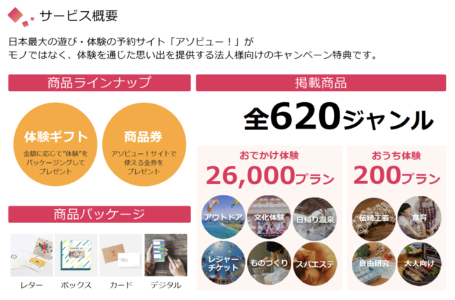 アソビュー!では法人様の販促キャンペーンや福利厚生でご活用いただける体験ギフト「アソビュー!ギフト For Bussiness」を提供しております。