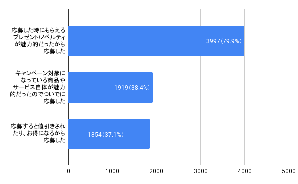 応募理由の中で、プレゼント/ノベルティの魅力が起因するという回答が全体の79.9%を占め、次いでキャンペーン対象になっている商品やサービスの魅力が起因する38.4%、値引きやお得が起因する37.1%という結果になりました。プレゼント/ノベルティの魅力は販促キャンペーンにおける参加率の向上に寄与する重要な役割であることがわかりました。