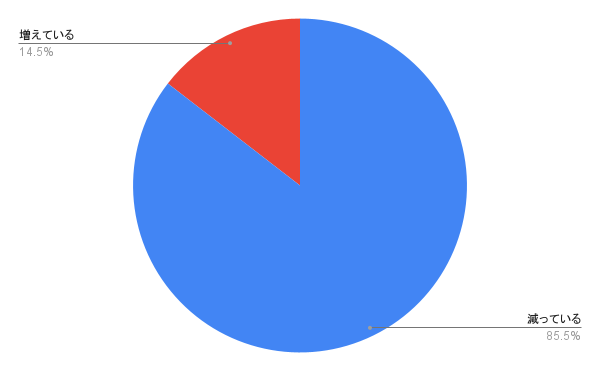 お出かけの機会の増減に関する問いでは、全体の85.5%が「減っている」と回答し、14.5%が「増えている」という回答になりました。コロナ禍による感染拡大の懸念や、行動制限などで外出の機会が減っていることがわかります。