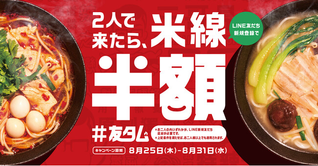 期間中、2人の来店で、タムジャイサムゴー公式LINEアカウント新規登録でもらえる友タムクーポンを注文時に提示いただだくと、クーポン1枚につき2名様分の米線が半額となります。対象店舗は、新宿中央通り店、吉祥寺店、恵比寿店の全店となります。