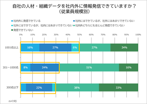 1.自社の人材・組織データを社内外に情報発信できていない企業は6割以上であり、従業員規模が大きくなると、情報発信にも積極的な傾向にある。