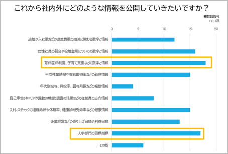 4.報酬の情報や、従業員の志向の情報は開示している企業はごくわずか。今後は「育児・子育て支援に関する情報」「人事部門の目標指標」を開示したい企業が多い。
