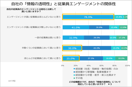 2.「経営層から若手・新入社員層」まで、全ての社員が自社の情報の透明性に満足している企業は、わずか1割。さらに、「自社の従業員エンゲージメントは他社に比べて低い」と回答した企業は、自社の情報の透明性に満足しているのは「経営者のみ」であると約8割の企業が回答している。情報の透明性と従業員のエンゲージメントには相関がある。