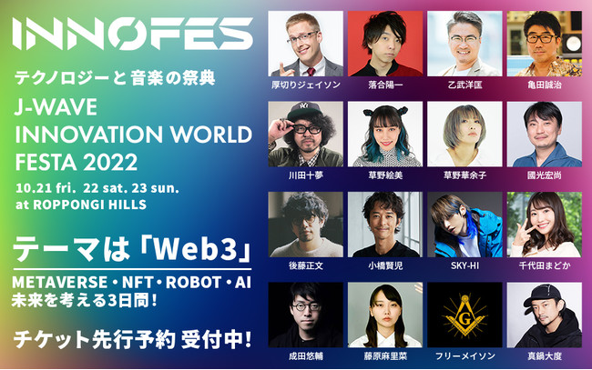 ラジオ局J-WAVE(81.3FM)は筑波大学とともに、日本最大級のクリエイティブフェスティバル「J-WAVE INNOVATION WORLD FESTA 2022」(以下、イノフェス)を、2022年10月21日(金)、22日(土)、23日(日)の3日間、六本木ヒルズで新型コロナウイルス感染症対策を行った上で、有観客とオンライン配信のハイブリッドで開催いたします。開催発表に伴い、出演者第一弾として豪華イノベーター陣29組を発表いたします。ライブ出演アーティストは後日発表。