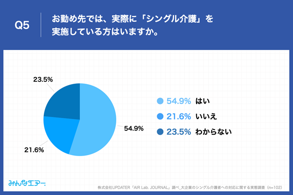 「Q5.お勤め先では、実際に「シングル介護」を実施している方はいますか。」(n=102)と質問したところ、「はい」が54.9%、「いいえ」が21.6%という回答となりました。