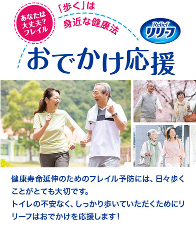 そこで、このたび、2017年より実施しているおでかけ応援教材セットの無償提供をより広げることといたします。軽失禁や頻尿などの症状がある方でも歩行に適した尿ケア品を活用することで、トイレの不安なく外出し、しっかり歩いていただくことを支援する教材セットとなっています。歩き方の提案や薄型おむつの体験を通して、より多くの方のフレイル予防や健康寿命の延伸に貢献してまいりたいと思います。