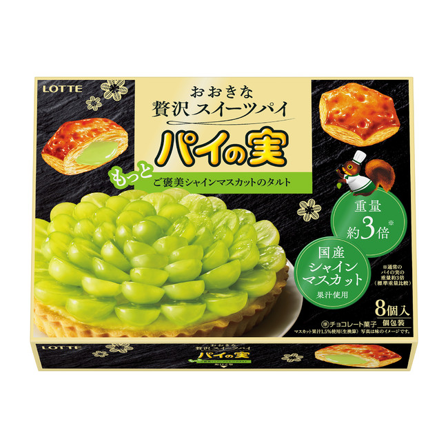 株式会社ロッテは、発売40年以上のロングセラー商品「パイの実」シリーズから、サクサク食感のパイ生地に、国産シャインマスカット果汁を使用したチョコレートをとじ込めた『おおきなパイの実<もっとご褒美シャインマスカットのタルト>』を8月30日(火)よりロッテグループ公式オンラインモールにて12,000個限定で発売します!
