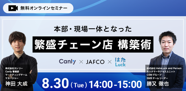 Googleビジネスプロフィール(旧・Googleマイビジネス)・HP・各SNSの一括管理サービス「Canly(カンリー)」の開発・提供を行う株式会社カンリー(所在地:東京都渋谷区、代表取締役:辰巳 衛,秋山 祐太朗)は、2022年8月30日(火)に株式会社HataLuck and Personとの共催ウェビナー『本部・現場一体となった~繁盛チェーン店 構築術~』を開催することとなりましたのでご案内いたします。