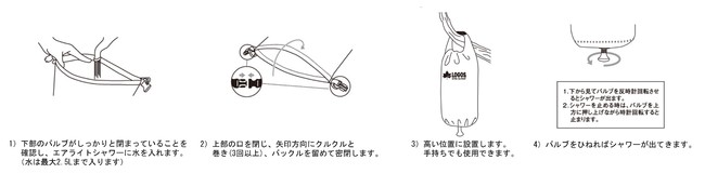 本体に水を入れ、上部の口を閉じて密閉し、バルブをひねるとシャワーが出てきます。