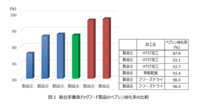 飼料のタンパク質評価法であるペプシン消化率を用いて、ドッグフードにおけるタンパク質の消化率を測定しました。チキンを主原料とする市販のドライタイプの総合栄養食ドッグフードで、エクストルーダーによるHigh Temperature Short Time(HTST)加工(4)品3種、熱風乾燥品1種、フリーズドライ製品2種(うち1種は当社開発品)を、試験に用いました。その結果、フリーズドライ製品は、HTST加工や熱風乾燥に比べ、高いペプシン消化率となりました(図1)。このことから、フリーズドライ製品は、他の製品よりもタンパク質の消化率が高いことが示唆されます。