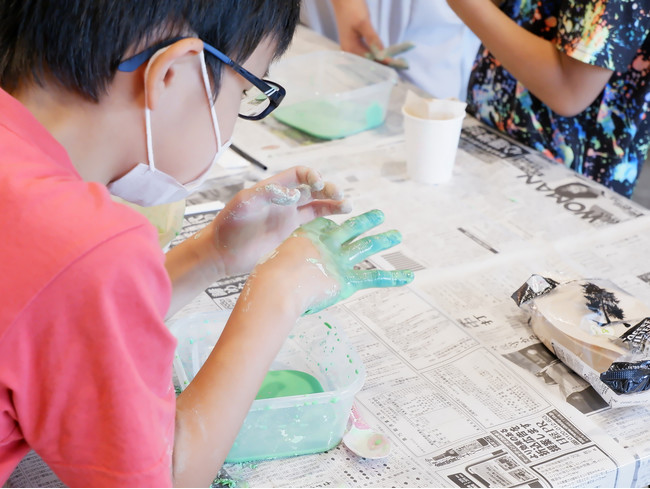 子供たちは、初めは恐る恐る指で触れていましたが、次第に両手で掴んだり、スプーンやコーヒーフィルターなどを使って‟未知の物体”の正体を想像し、「匂いがする」「ぎゅっと握ると粘土みたい」など、積極的に自分が気づいたことを発言していく姿が見られました。