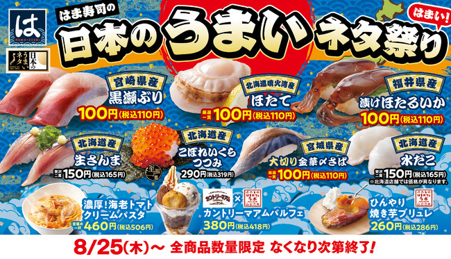 株式会社はま寿司(代表取締役社長:遠藤 哲郎 本社:東京都港区)が展開する100円寿司チェーン「はま寿司」は、8月25日(木)から「はま寿司の日本のうまいネタ祭り」を全国の店舗で開催します。